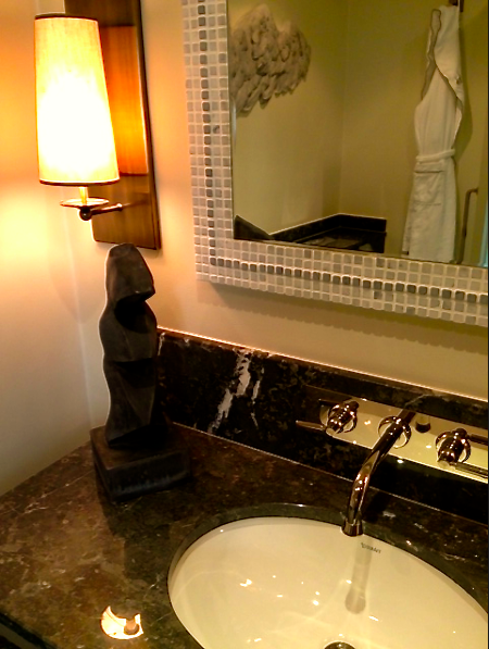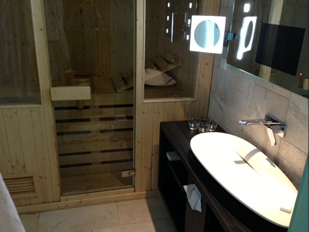 We stayed in a Waterfront Spa room which (surprisingly ;-)) had a fantastic view on the harbour. It was a very large room (approximately 44 m2) and the huge jacuzzi was definitely the highlight of the room with a diameter of 1,70 meter. We then noticed the XL Kingsized bed. 3 people could easily sleep in this bed, without doubt! Other features: a comfy couch, a beautiful desk and an Illy coffee machine. You could even relax in your private Finnish sauna in the bathroom. The large rainshower works perfect and is very useful after the sauna session. The mirror tv is a plus too. This truly is what a spa room should be. The decor is modern, but without being too “cold”. Please note the pinguins on the wall. Would I decorate my home like that, no … but in this hotel it is just perfect!