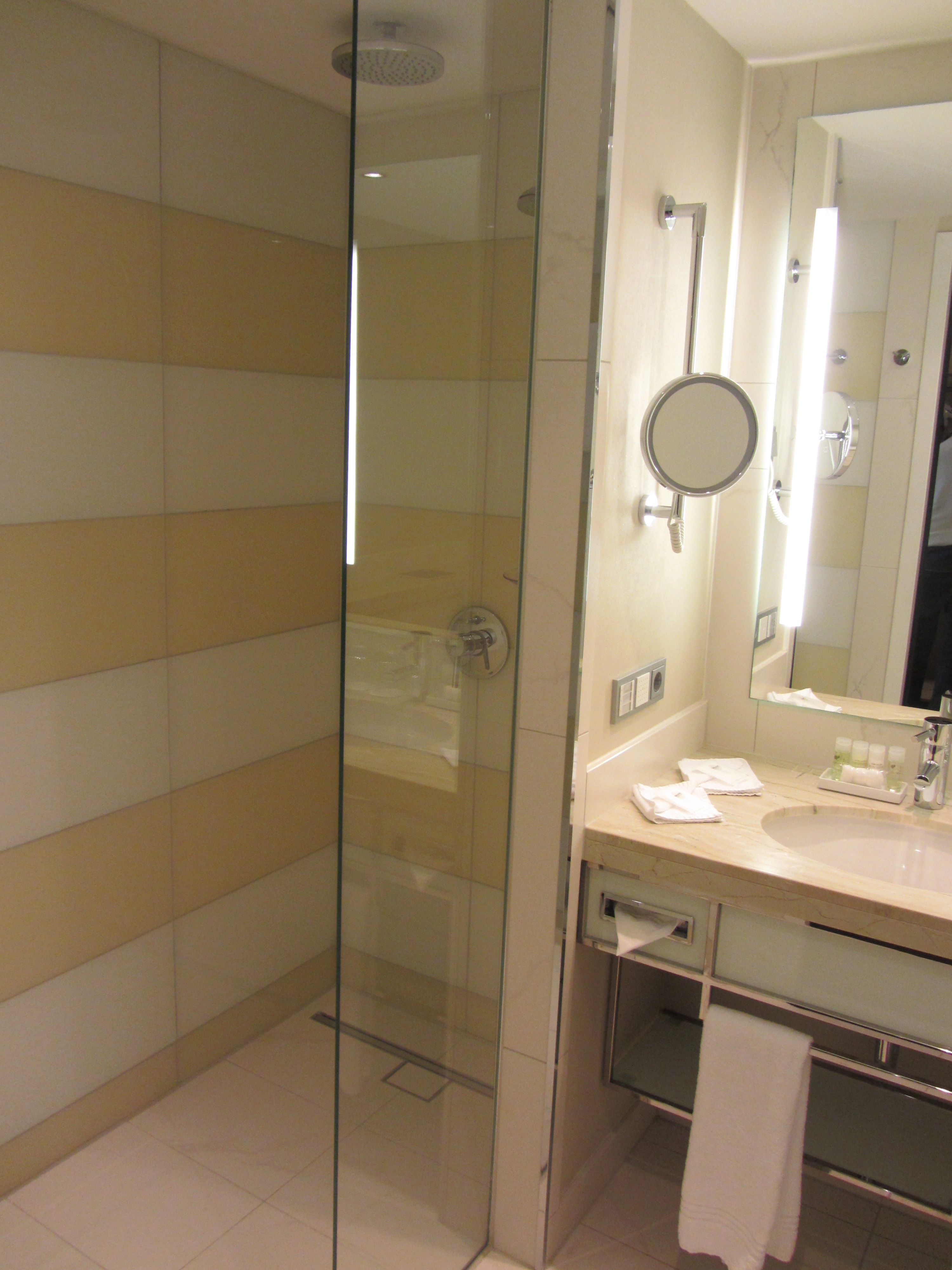 Rooms of the Westin Grand Berlin are of a 5 star level. I had a great night’s sleep, the beds are great! The room had a good size and had all the amenities I needed such as a great minibar, comfy lounge chair, desk and a good wifi connection. Bathroom had single sink, (rain) shower and toilet. The décor was nice, not too modern and not too old fashioned. There was a tablet in the room which was very handy, all the information about the hotel can be found on it and making reservations is so easy. Of all the hotels I visited in Berlin, I liked the rooms of the Westin Grand the most!