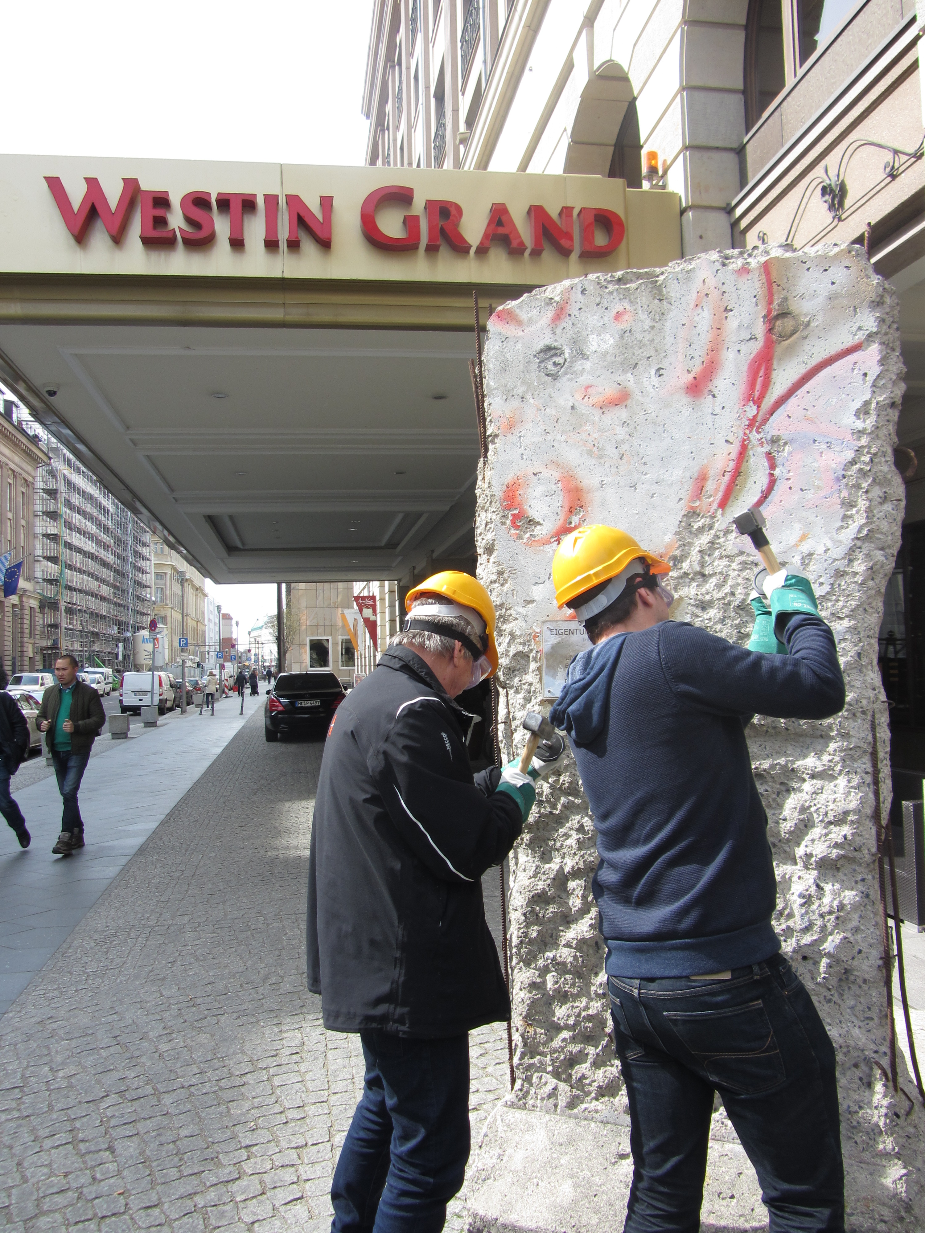 They offer the “Tear down the wall” package where guests have the chance to chip an own historic keepsake out of a segment of the original Berlin Wall located in front of the hotel. Afterwards, you will receive a photograph and a certificate of authenticity as well as refreshments in the form of Berlin-style curried sausage and a glass of Champagne. We did the wall picking activity and thoroughly enjoyed the experience! It is so much fun… and really unique! Loved it!