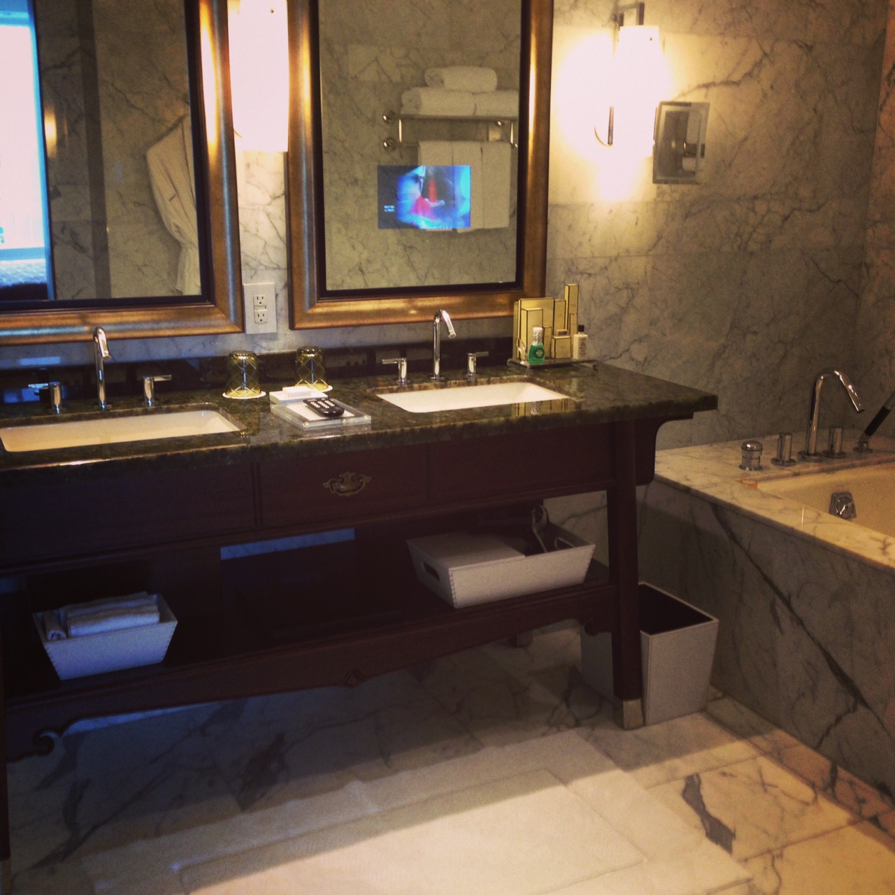 All rooms at the Shangri-La Toronto have iPads and are equipped with the latest technology, such as electronicly controlled lights, drapes and temperature. We stayed in one of their one bedroom suites which was elegantly decorated… It had a separate living room and bedroom. The living room had a nice little saloon and full sized desk. I appreciated the Nespresso coffee machine and housekeeping provided pads every day. Sleeping in the bed was like sleeping on a cloud! It felt so good! The bathroom was one of the nicest bathrooms I have ever seen! They are very large and luxurious with double sink, separate shower, oversized bathtub and I loved the mirror television. Toiletries were of a very good quality and we had plenty of them in our room.