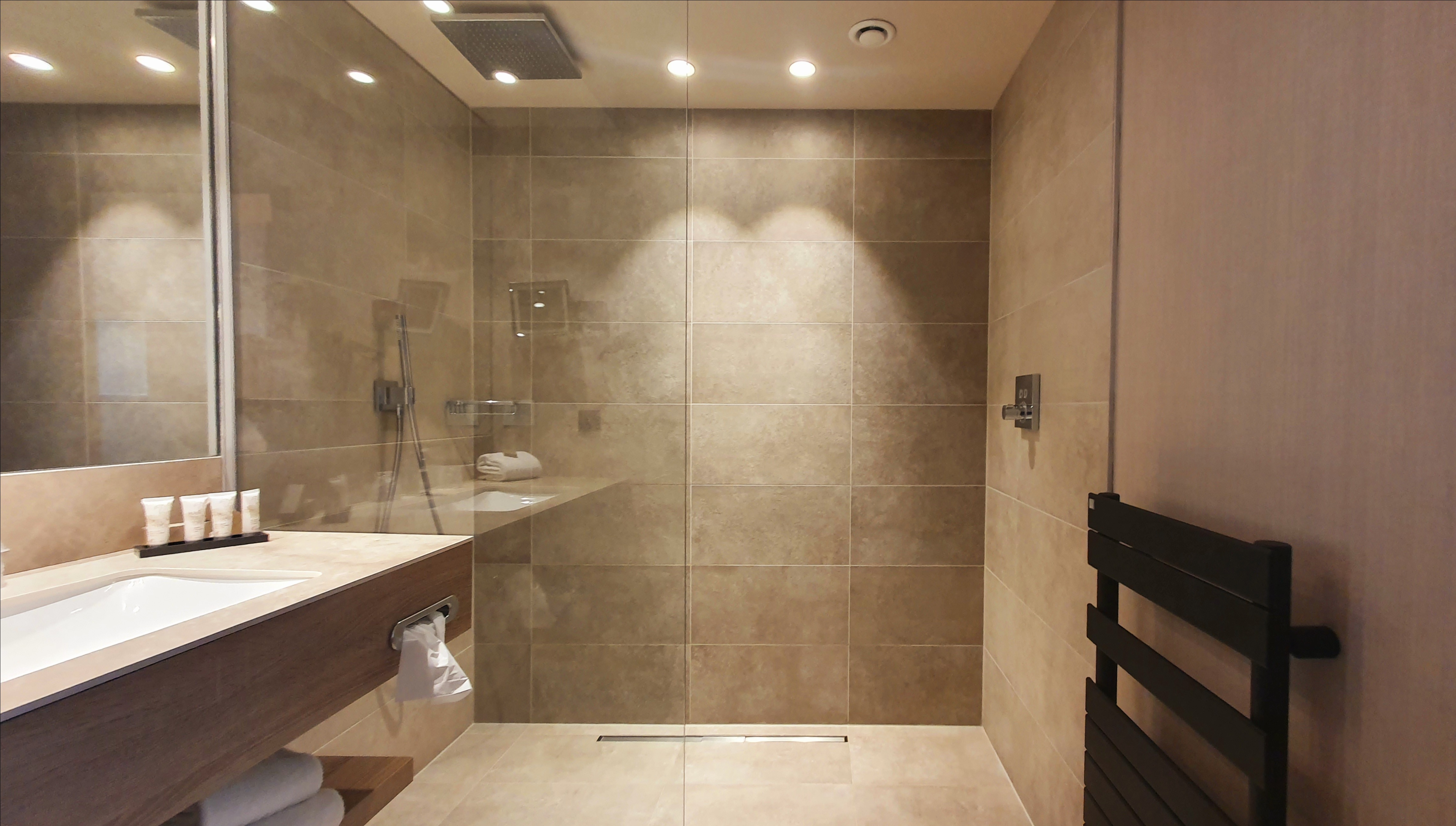 Bathroom is very luxurious featuring an oversized bath tub and a fantastic walk-in shower. There are plenty of luxury Cinq Mondes toiletries offered. The mirror television was a treat!