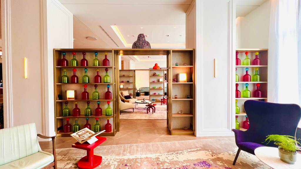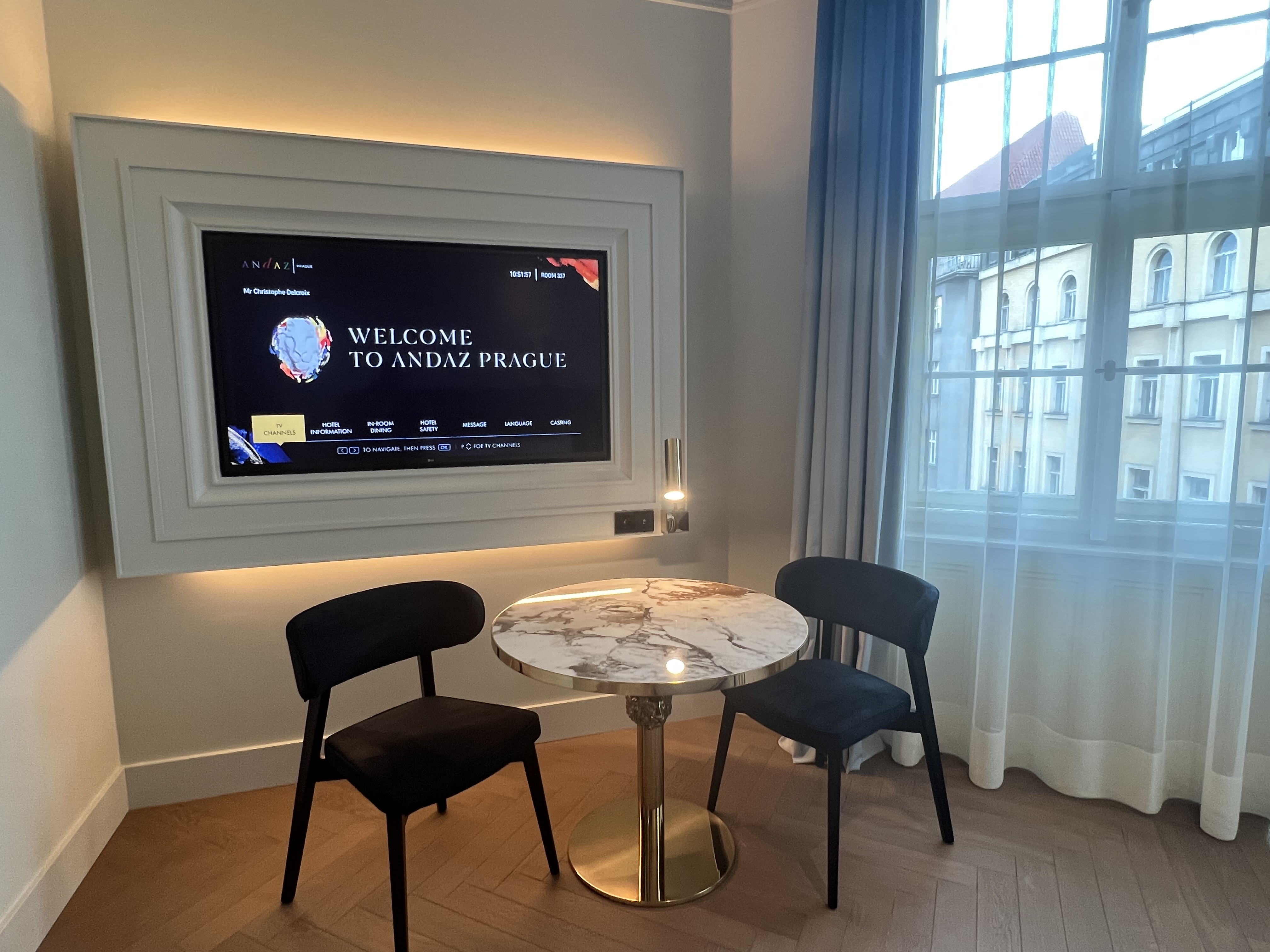All the guestrooms at Andaz Prague are unique and very tastefully decorated. It’s all about the details and to be honest, the bed was one the best I have ever experienced! What I appreciated about my room were the small funny elements such as the 2 golden hands holding the drapes open, the giant lion head above the bed, the small golden guy hanging on the mirror in the bathroom… Those small things made me feel that I’m not just in a regular hotel. Andaz Prague has a personality which I liked very much. Other amenities I appreciated were the designer elements in the room and not to forget: a complimentary mini bar with local soft drinks and snacks. The room was modern, opulent and charming at the same time, perfectly appointed and completely functional. I loved the comfy lounger, large marble table and 2 comfy chairs. I had a few requests and everyone, from housekeeping to room service or the food and beverage servers, makes it their goal to treat all their guests like VIPs.