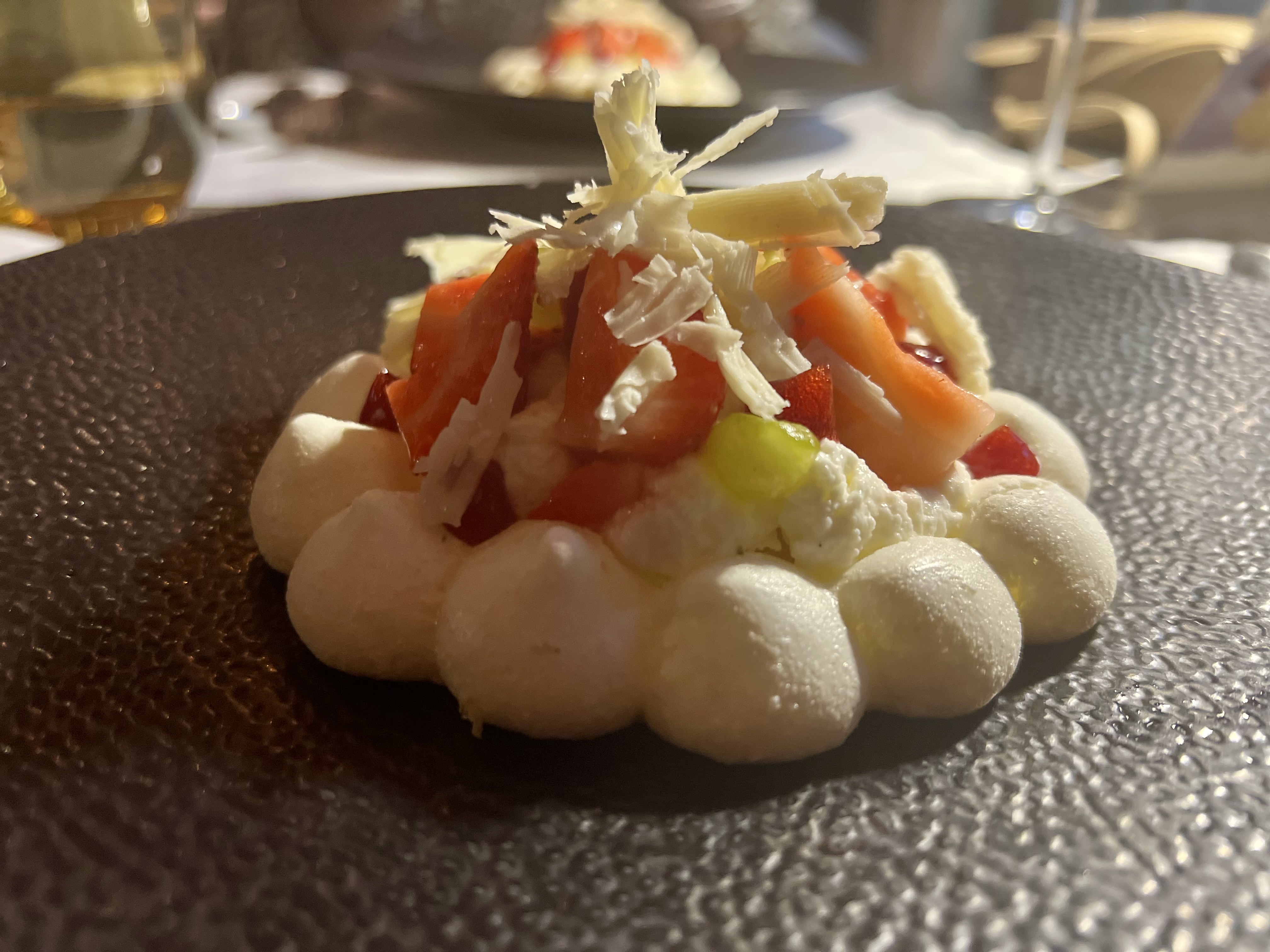 The dinner commenced with the tantalizing Summer Ceviche, a refreshing dish bursting with flavors of the season. The combination of fresh seafood, citrusy notes, and a hint of herbs created a harmonious and light starter that set the stage for the culinary feast to follow. he main course was an exquisite serving of Salmon Trout sourced from the pristine waters of Lambachtal. The fish, cooked to perfection, offered a delightful blend of textures and was accompanied by an array of complementary flavors that left guests in awe of the culinary artistry. To conclude the meal, we were treated to a divine dessert featuring the freshest Schwarzbachtal strawberries. The delightful interplay of flavors, including elderflower, yogurt, and cucumber, created a sweet yet refreshing finale to an exceptional dining experience.